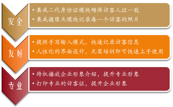 1. 通过公安部认证的加密模块直接读取来访者的身份证信息,以确保人证一致;